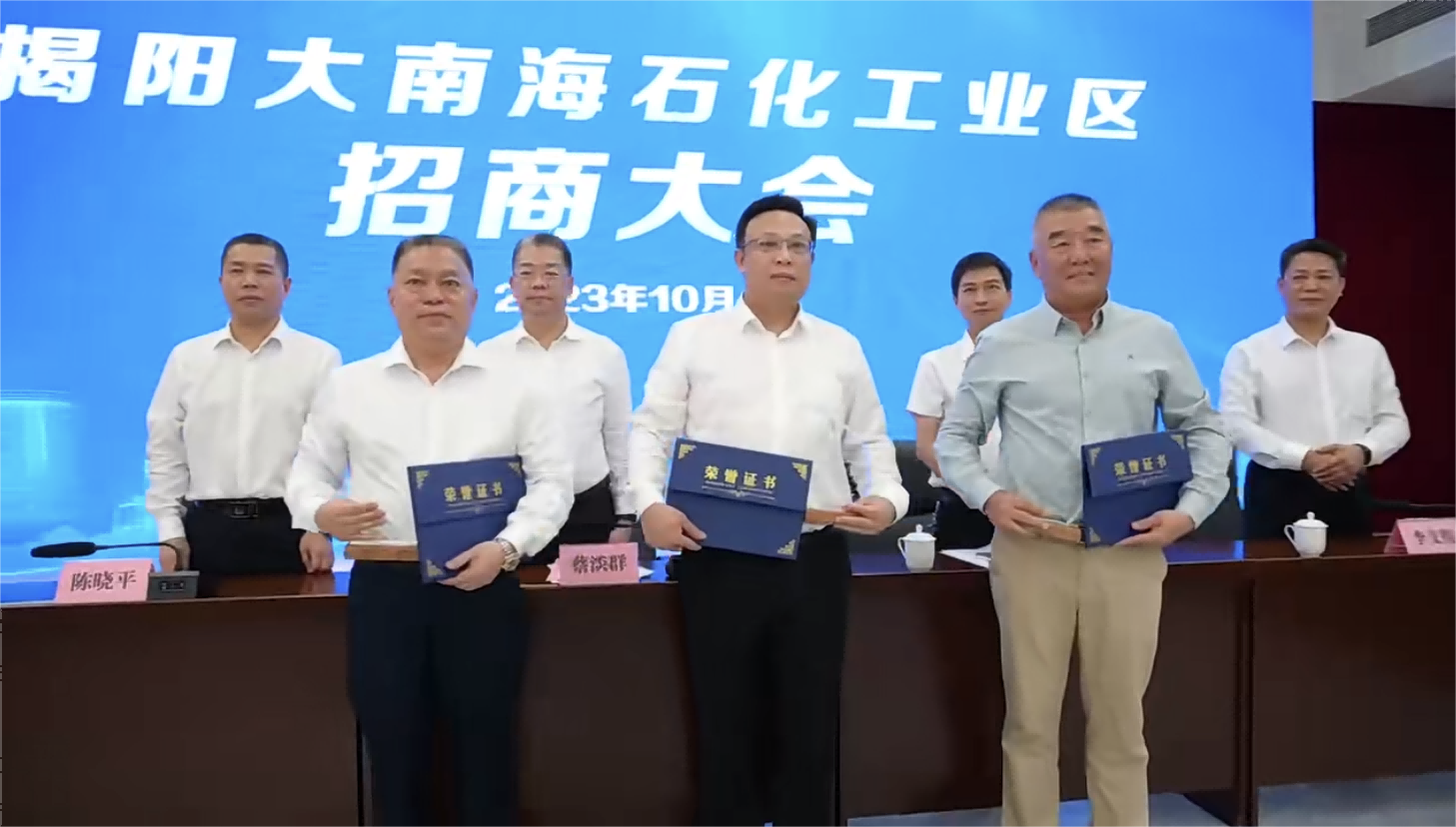 10月20日上午,揭陽大南海石化工業區招商大會順利舉行,以招商引資大突破助推發展動能大提升。揭陽市委常委、副市長、大南海石化工業區黨工委書記蔡淡群,大南海石化工業區黨委副書記、管委會主任陳曉平等出席會議,惠城環保集團創始人張新功受邀出席并被聘任為招商大使。